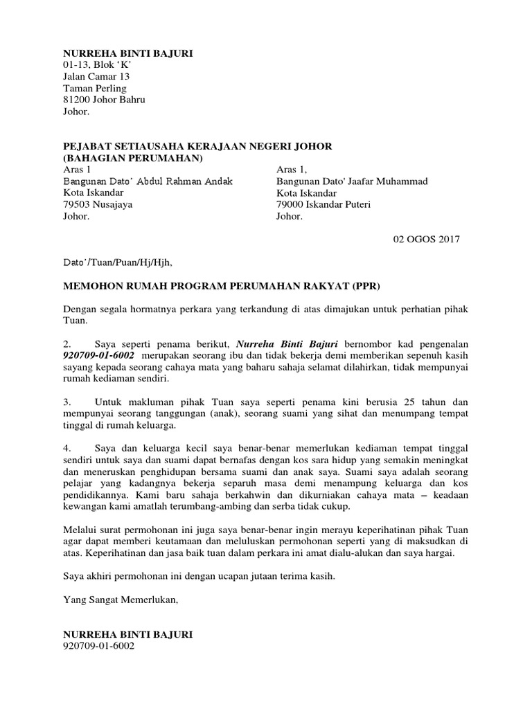 Contoh Surat Rayuan Permohonan Rumah Ppr : Contoh Surat Rayuan Kemasukan Sekolah Vokasional Backup Gambar / Contoh surat permohonan kerja rumah tangga inggeris.. Pendapatan isi rumah di bawah rm 3,000.00 sebulan; Contoh surat rayuan permohonan rumah ppr. Surat permohonan anekacontoh via anekacontoh.wordpress.com. « newer post older post ». Contoh surat rayuan permohonan warga negara.
